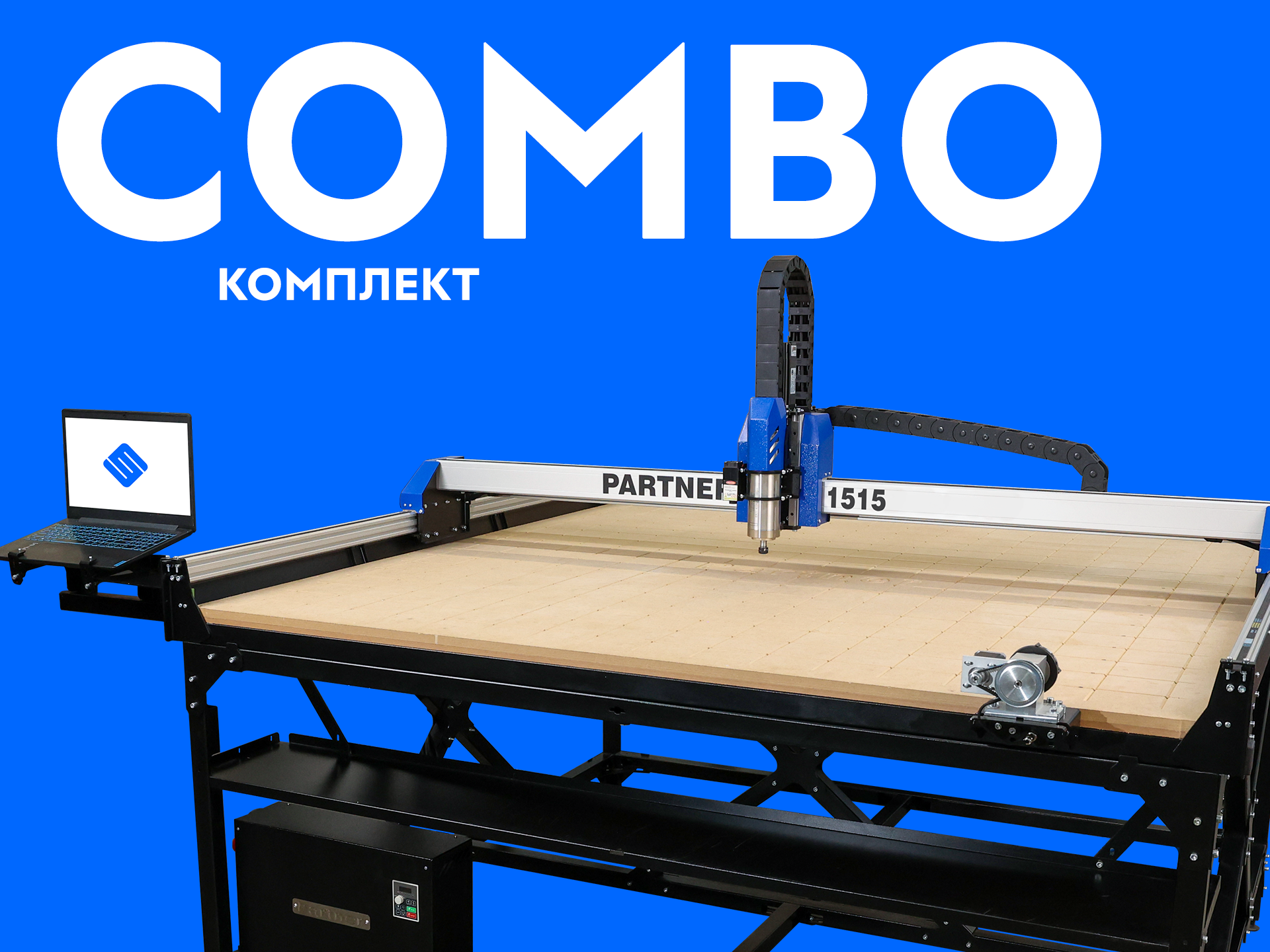 Combo Partner 1515 — это флагманский комплект из обновлённой линейки PARTNER, созданный для мастеров и предпринимателей, которым нужен максимальный рабочий формат без компромиссов. С рабочим полем 1500×1500×89 мм станок позволяет обрабатывать целые листы фанеры, МДФ и пластика без подрезки, что делает его идеальным решением для мебельного производства, рекламы, интерьера и серийного выпуска изделий.✅Что входит в Combo Partner 1515?