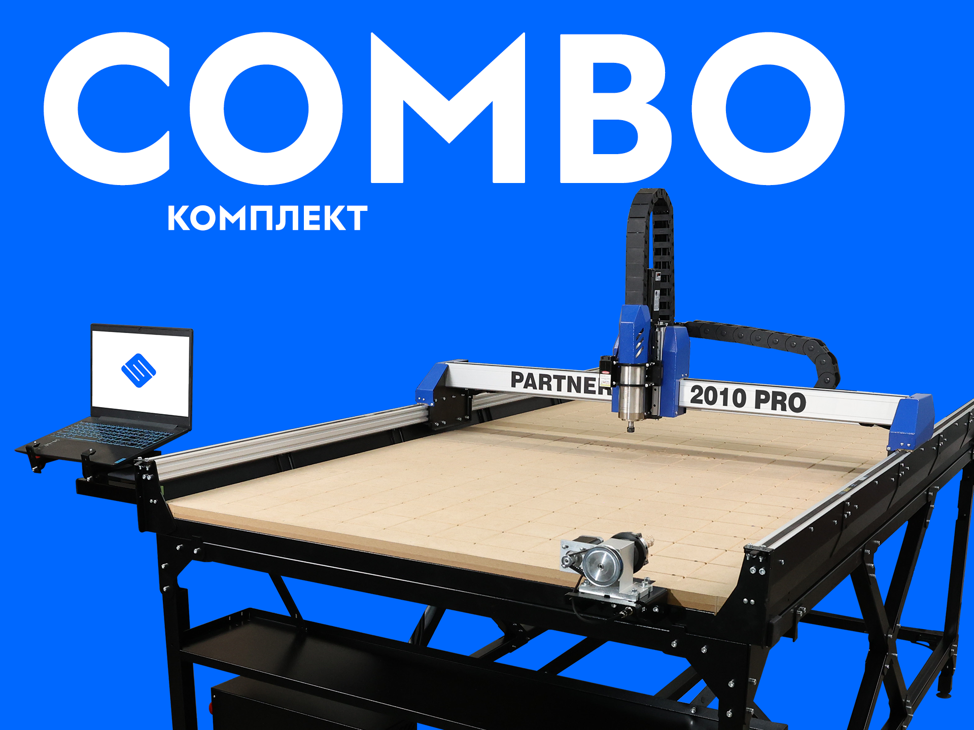 Combo Partner 2010 PRO — это флагманский комплект для мастеров и предпринимателей, которым нужен максимальный рабочий формат без компромиссов. С рабочим полем 2000×1000×89 мм и шпинделем 1500 Вт с жидкостным охлаждением, станок позволяет обрабатывать целые листы фанеры, МДФ, пластика и других материалов без подрезки — идеально для мебельного производства, рекламы, интерьерного декора и серийного выпуска изделий.Что входит в Combo Partner 2010 PRO?