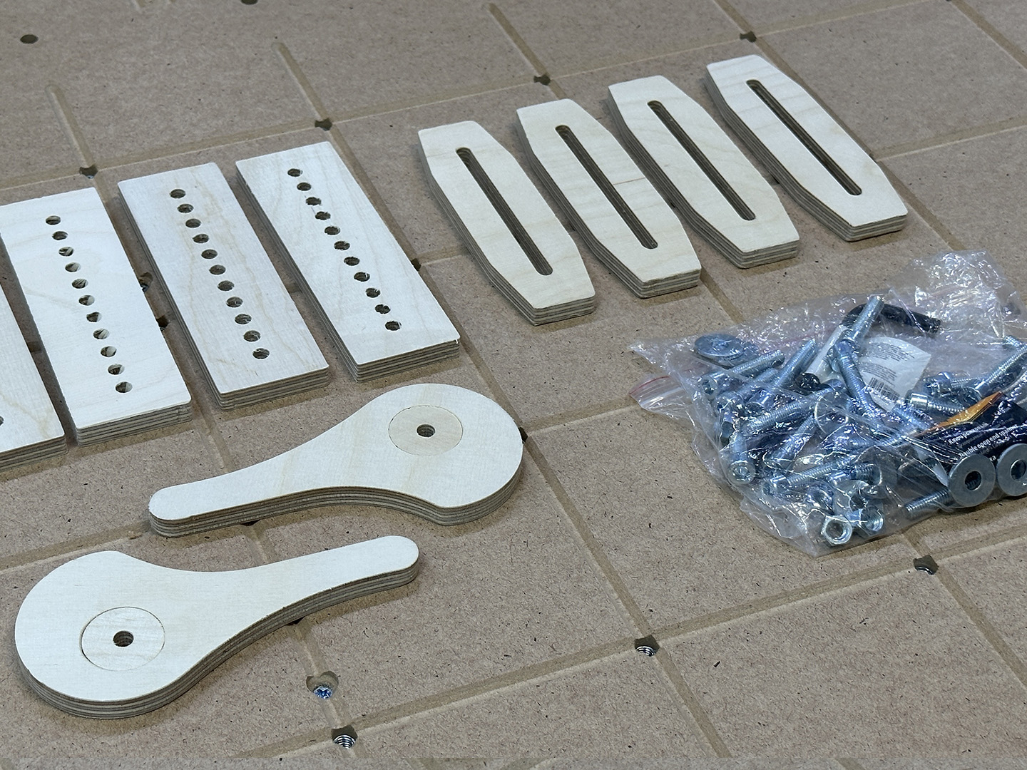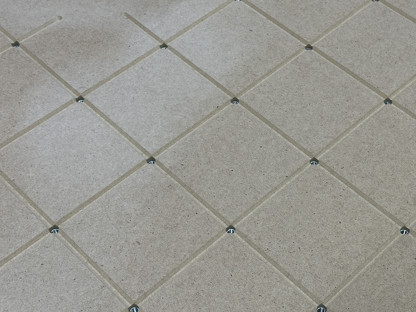 Данная система представляет собой лист МДФ толщиной 16 мм, размеченный сеткой 100х100 мм., на пересечении линий сетки в отверстиях располагаются потайные гайки на уровне на 5 мм ниже стола. В комплекте поставляются упоры, прижимные пластины, эксцентриковые фиксаторы, винты для крепления, а также гаечные ключи