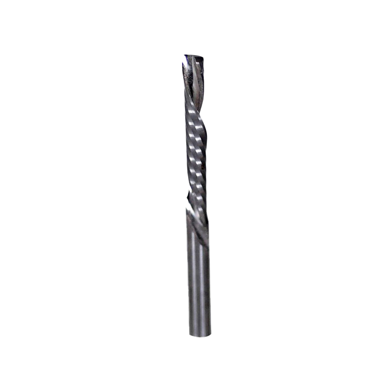 Геометрия фрезы обеспечивает отвод стружки вниз, что позволяет прижать материал к рабочему столу станка и получить чистую кромку вверху заготовки. Длинная канавка фрезы позволяет получить длинную стружку, которая препятствует забиванию фрезы и не допускает её перегрев, что увеличивает срок службы режущего инструмента.